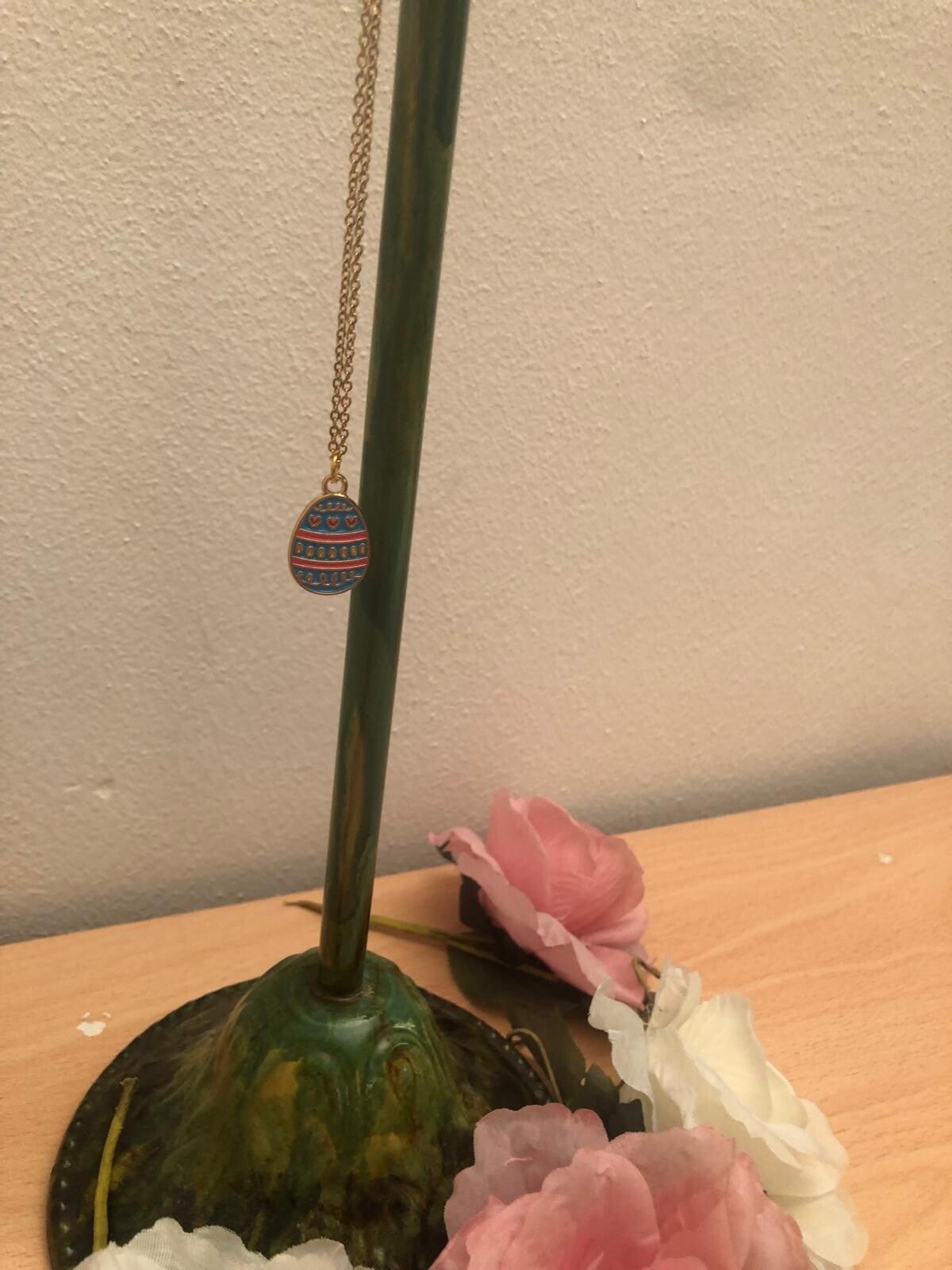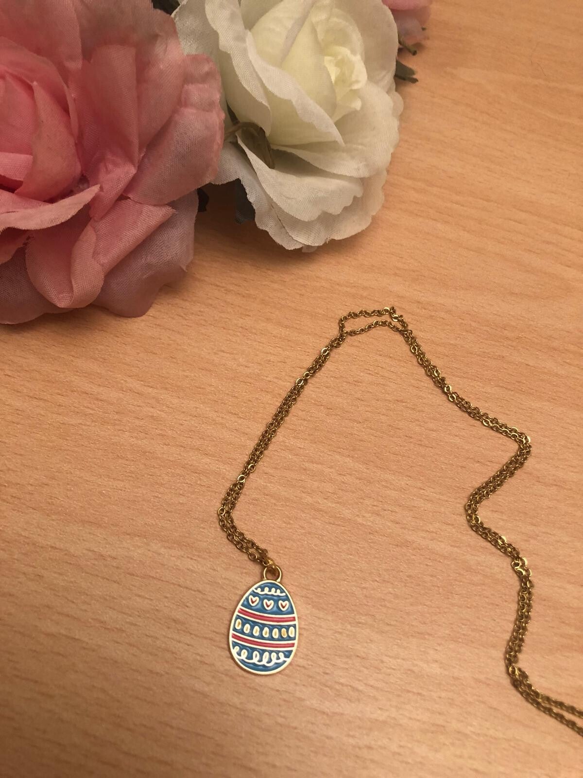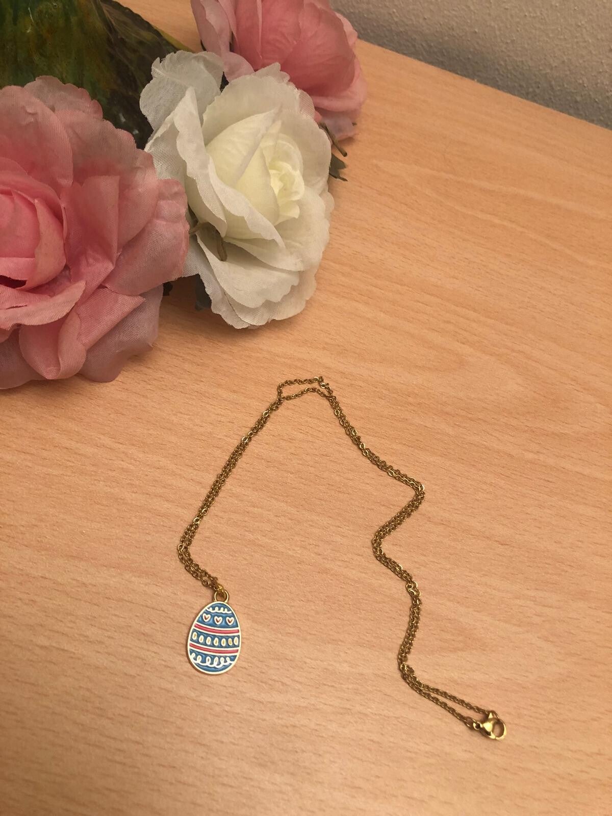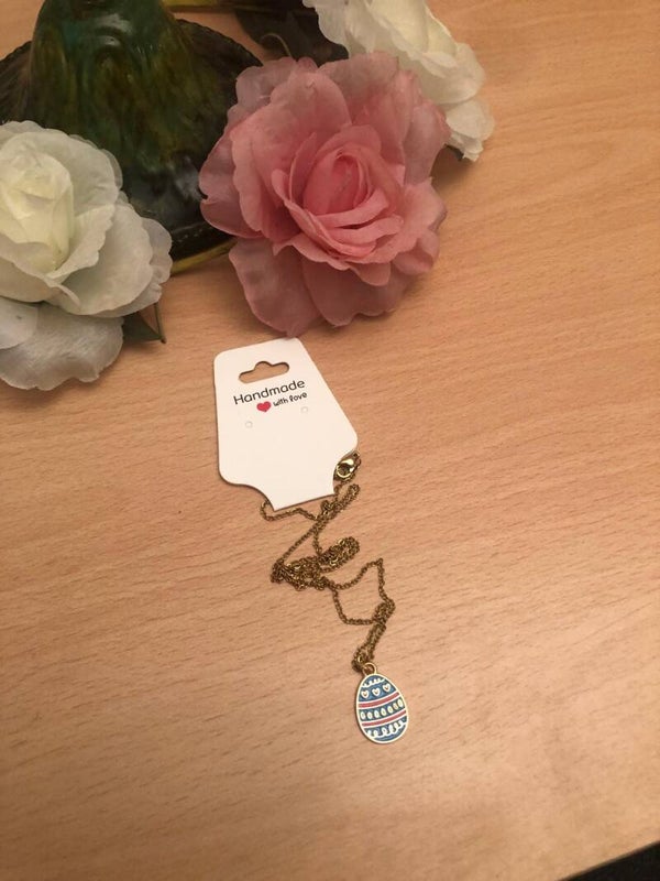Ketting met blauw paasei en hartjes.